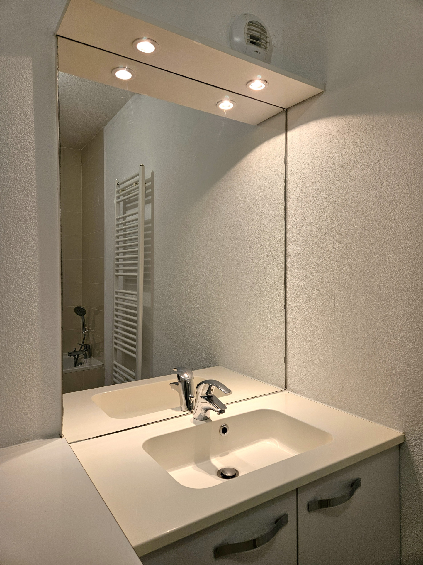 Fenêtres doubles vitrages PVC avec moustiquaires, sols stratifiés et carrelages VMC et détecteur de fumée, sèche serviettes dans la salle de bain