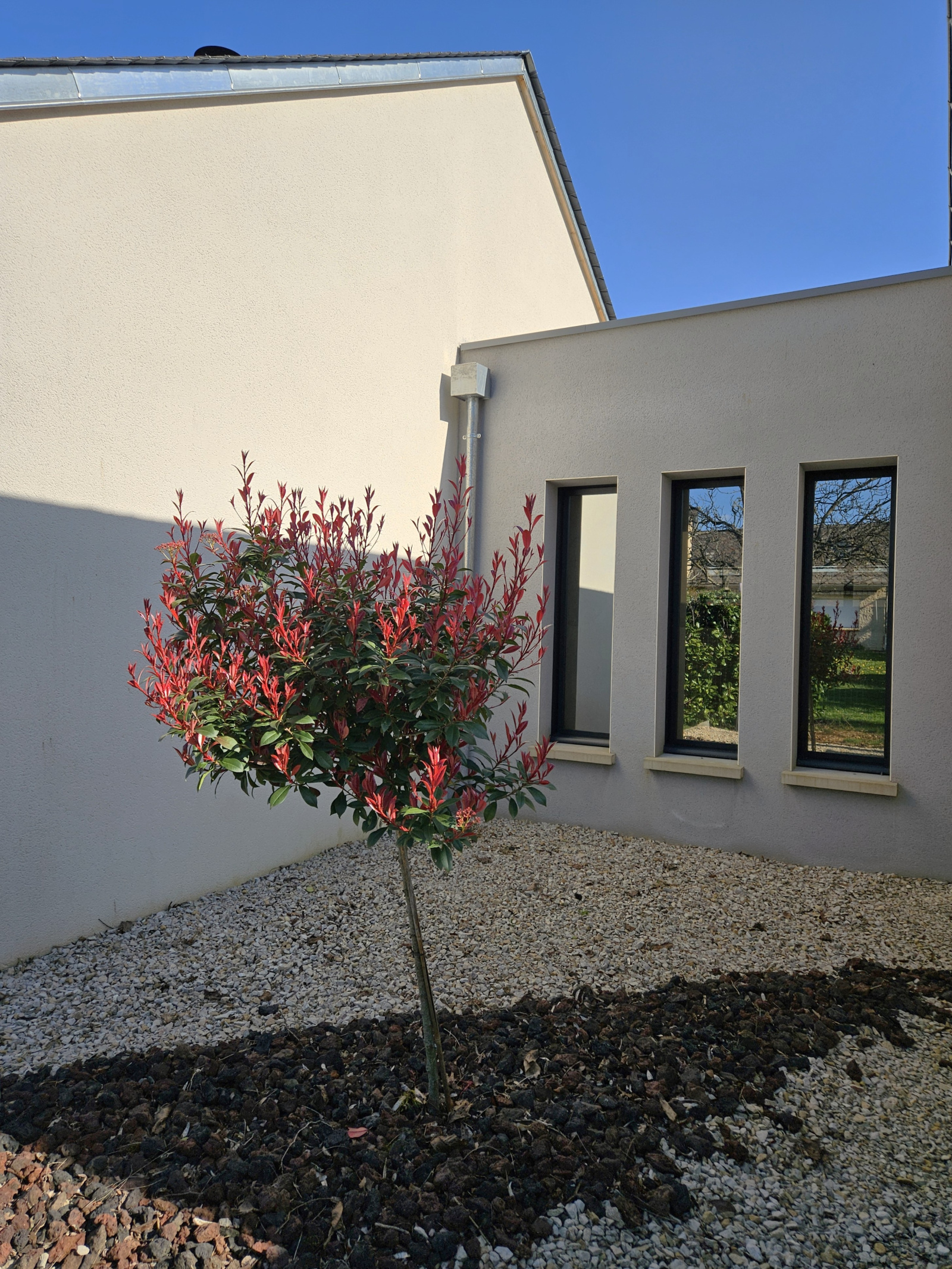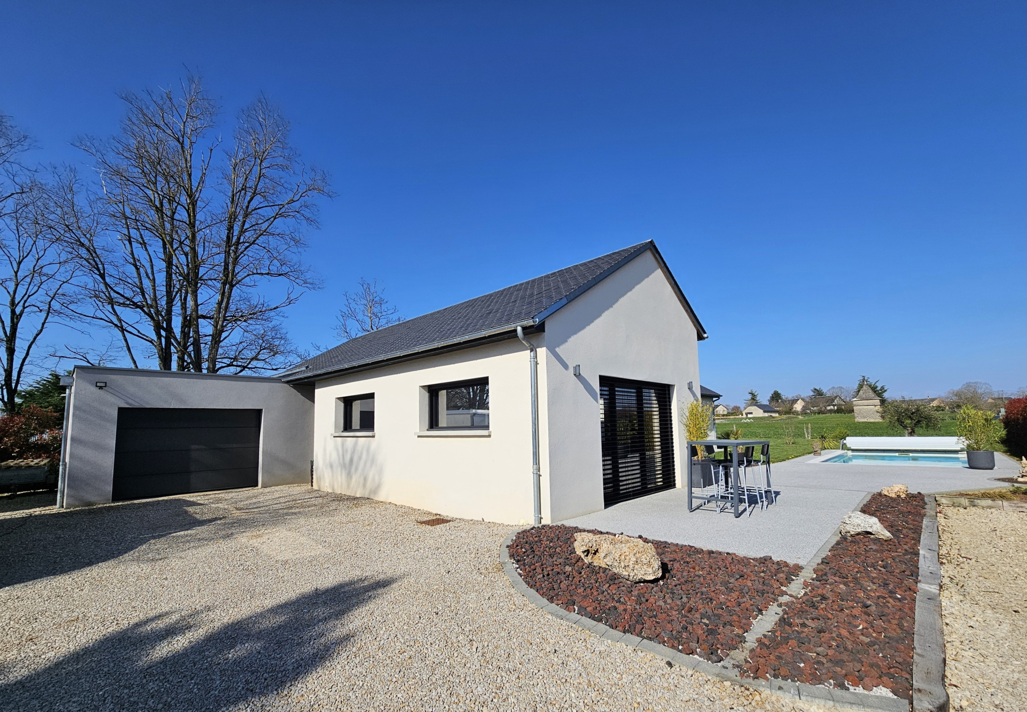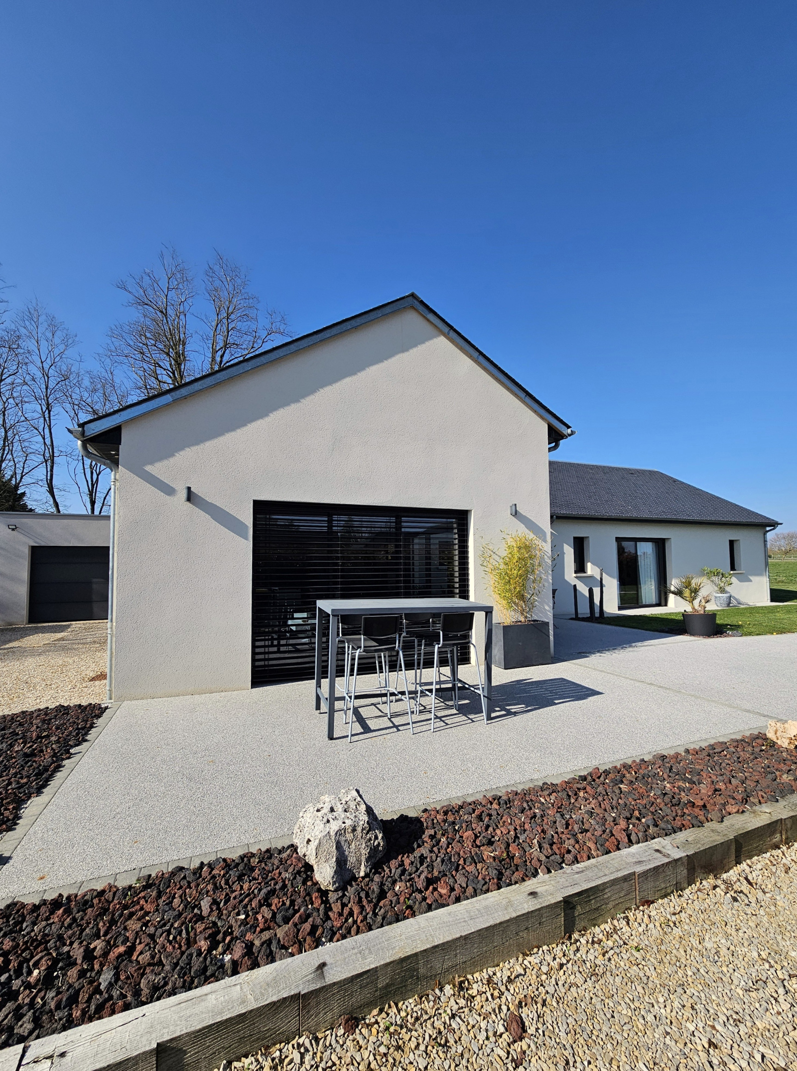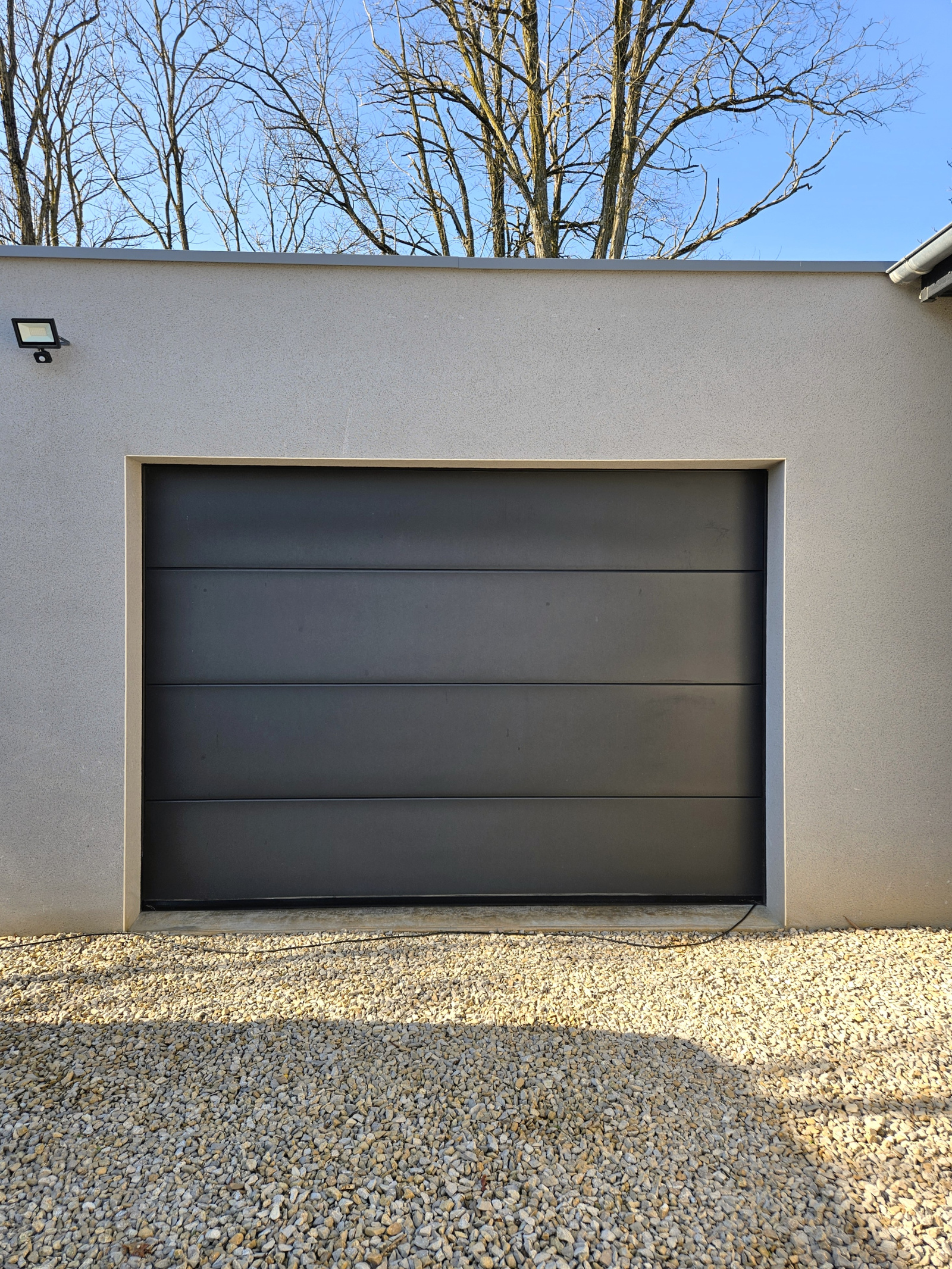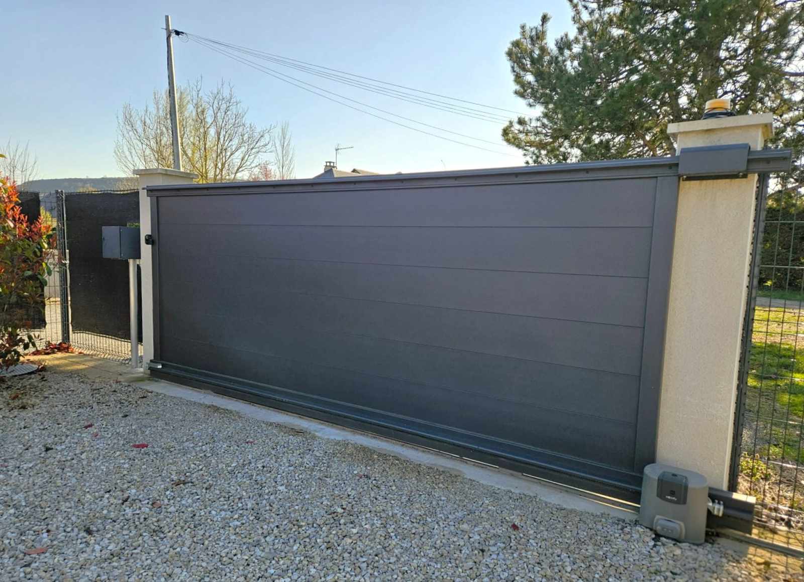 Entrée gravillonnée avec portail électrique, éclairages automatiques, visiophone