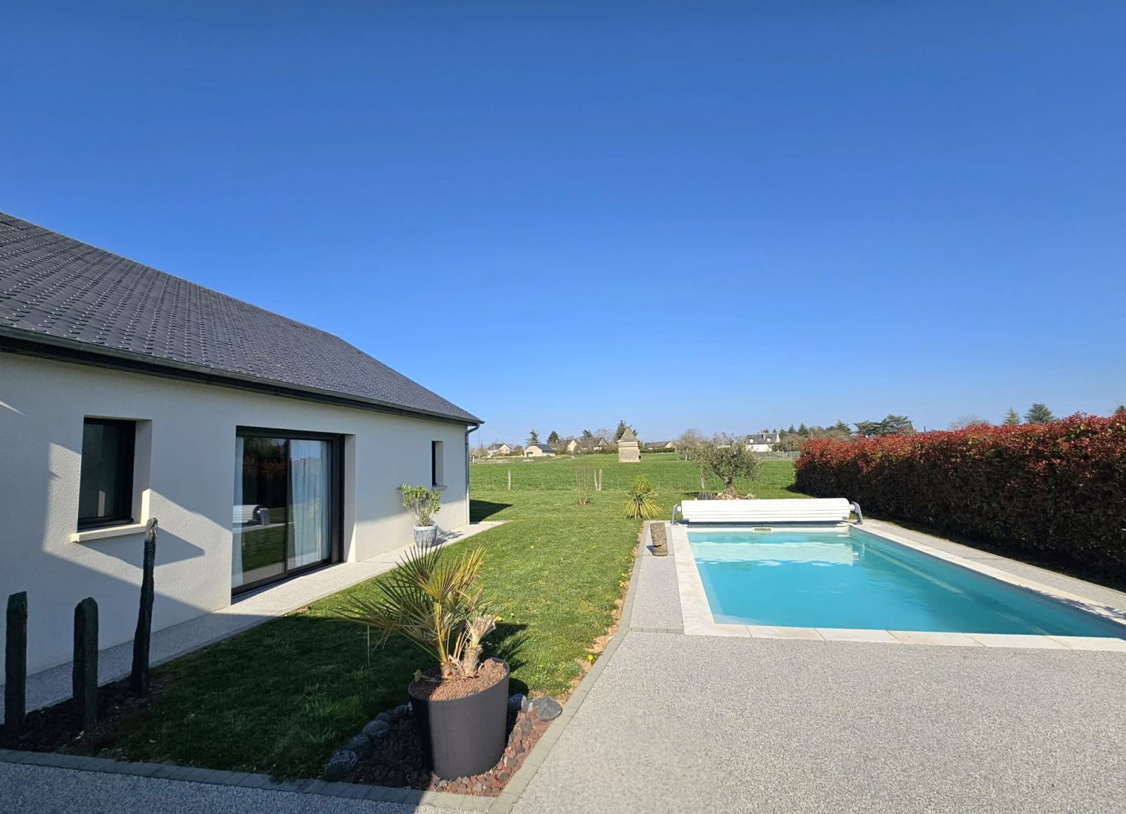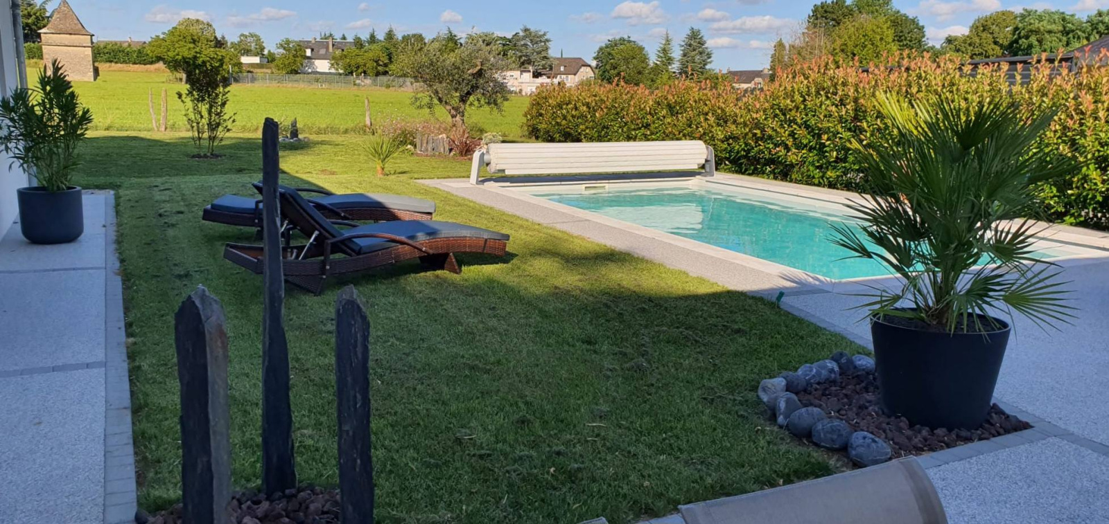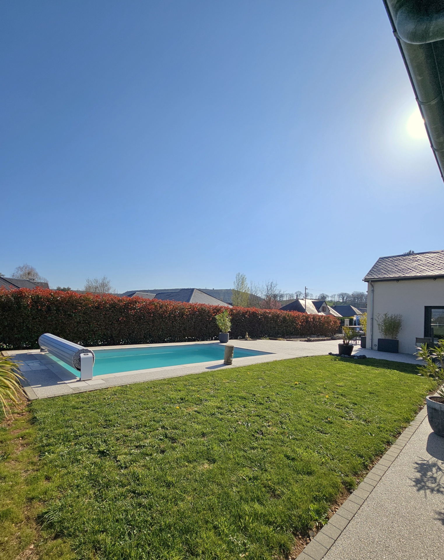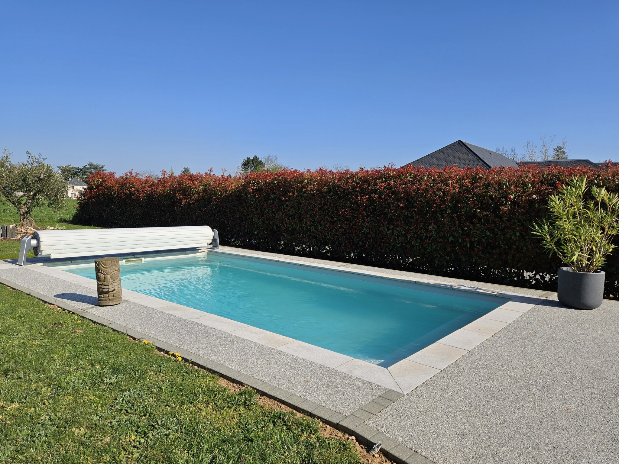 Piscine chauffée de 7 m x 3,5 m, rideau de fermeture homologué, solarium