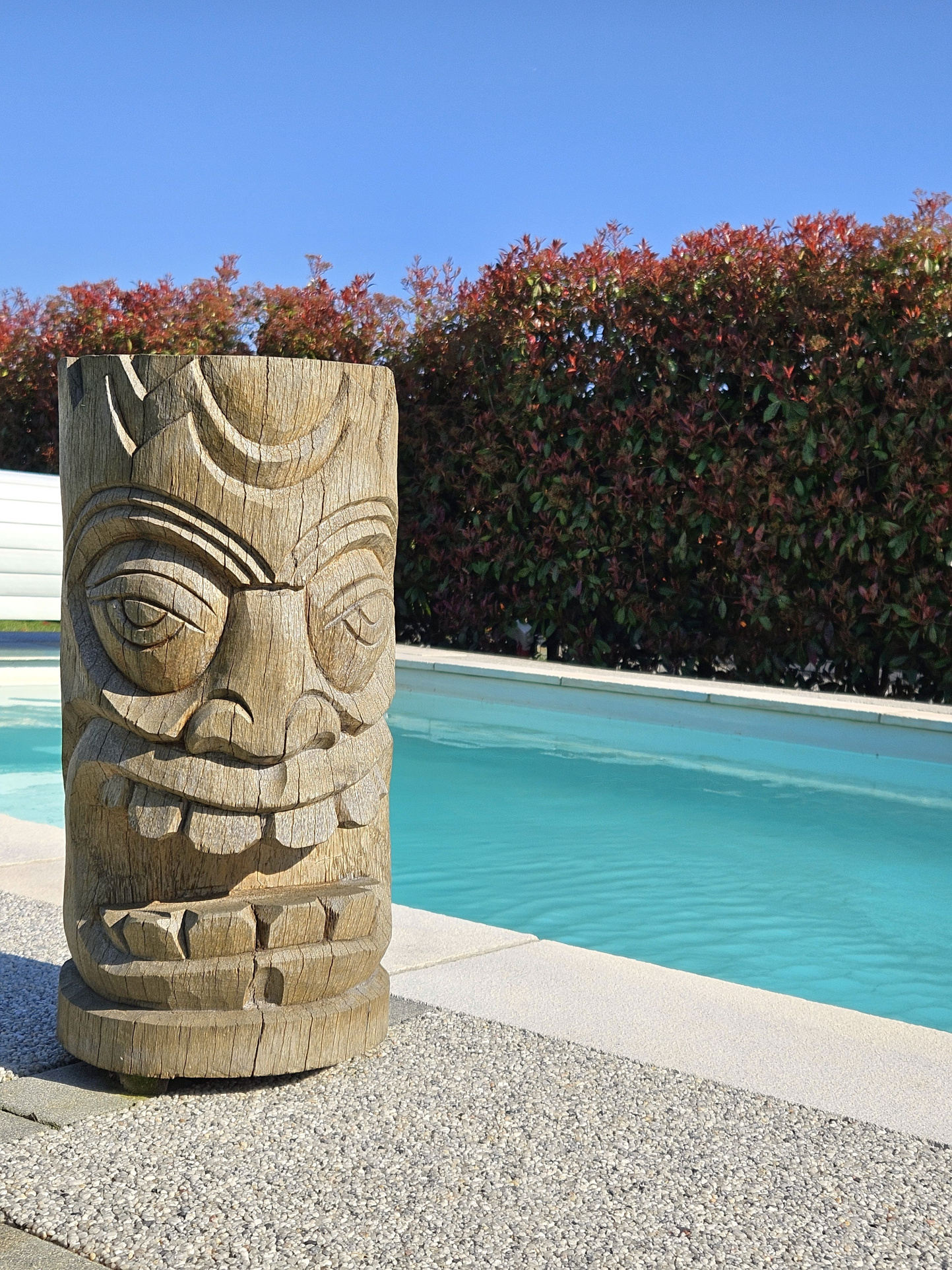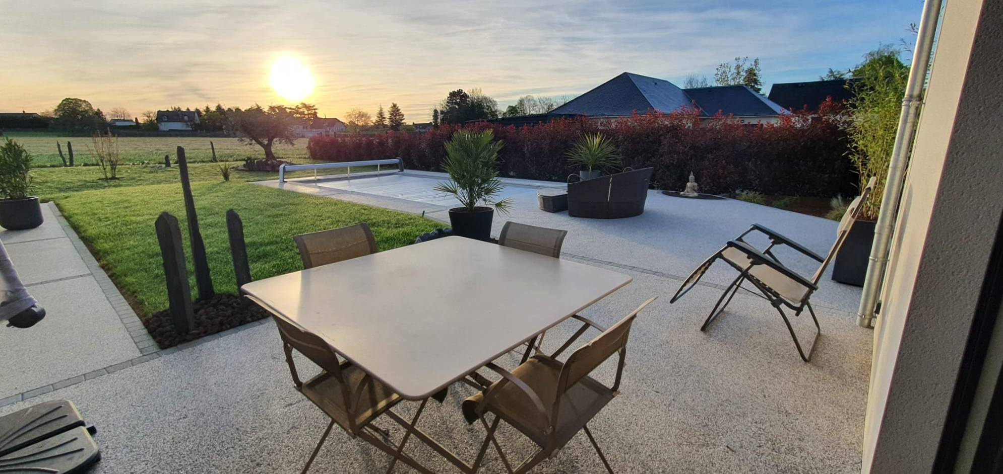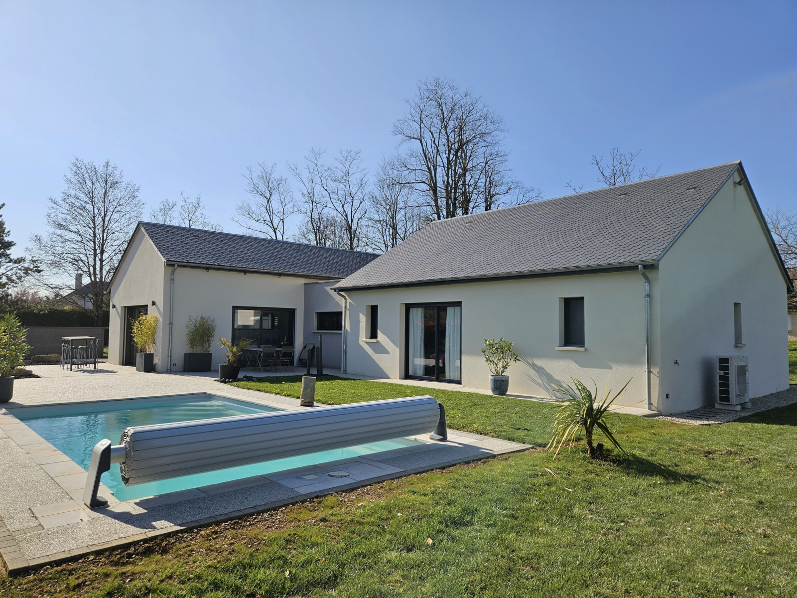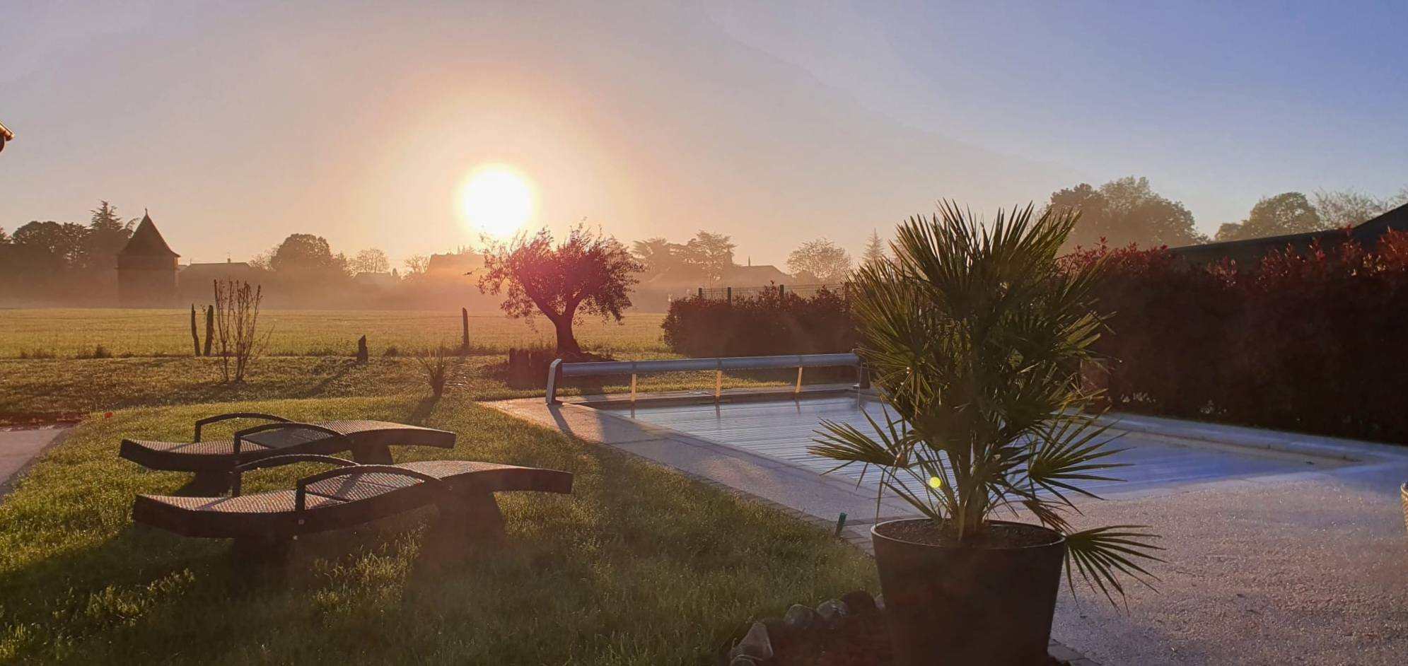 Piscine chauffée de 7 m x 3,5 m, rideau de fermeture homologué, solarium