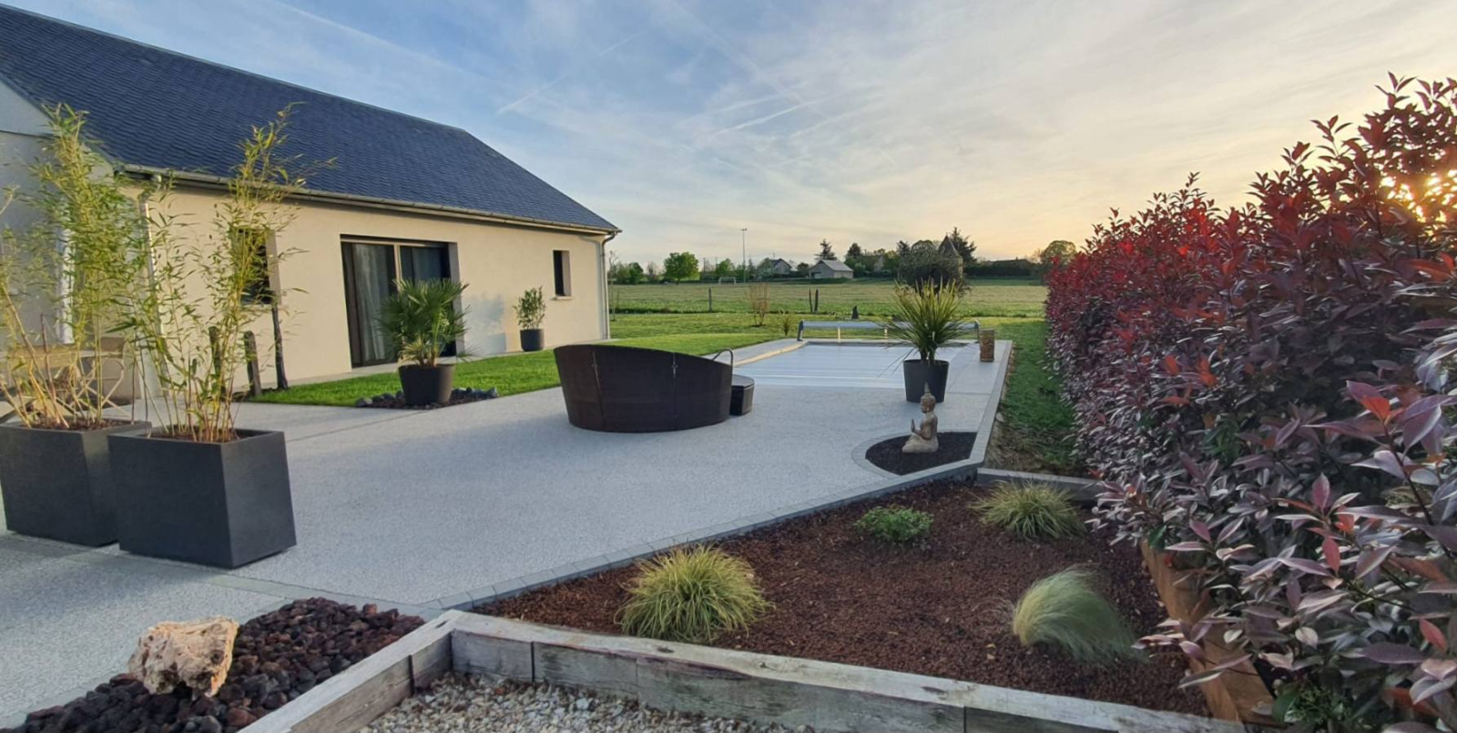 Deux terrasses avec revêtement drainant de haute qualité en quartz gris perlé et marbre type Hydrostar